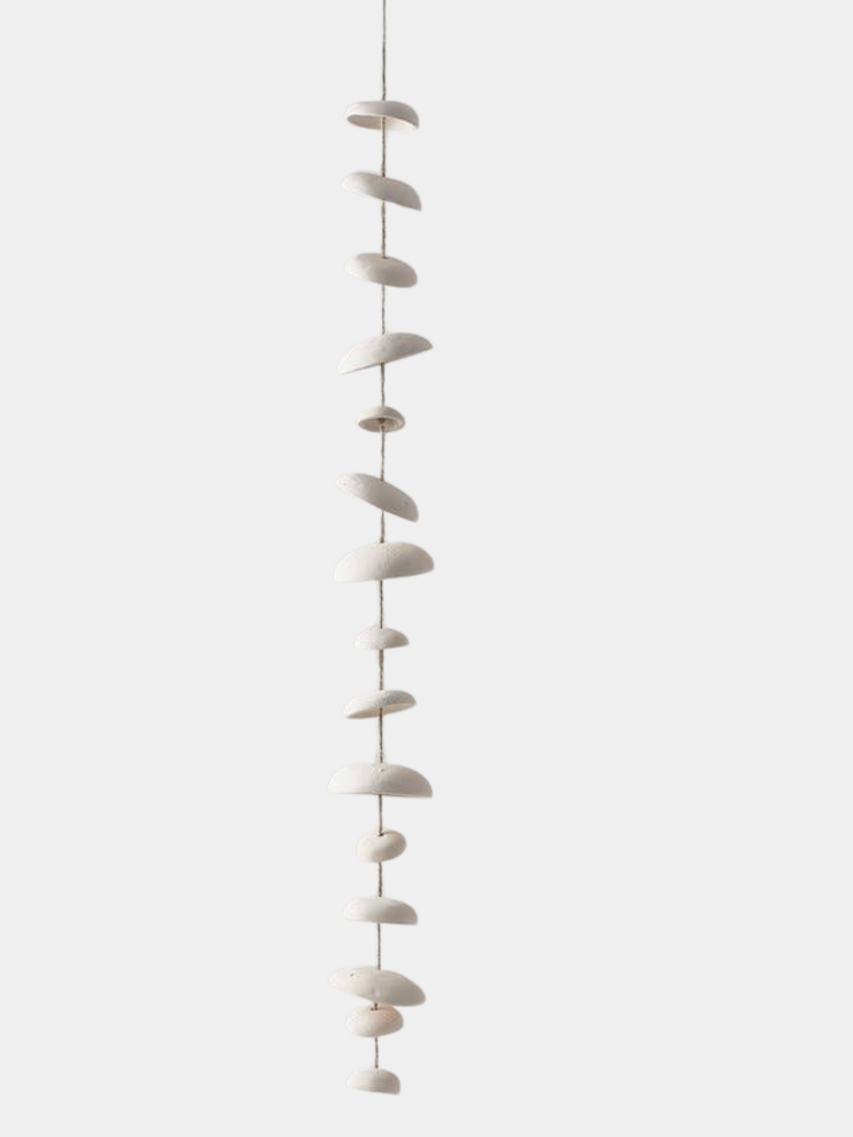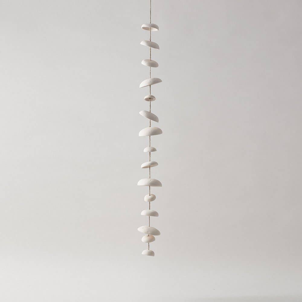 Each gorgeous moon bell is hand crafted and covered inside and out with my handmade creamy white glaze and fired twice. The 6 foot long strand consists of 15 bells in three approximate sizes; 5, 5" bells, 5, 4" bells and 5, 3" bells. I can also fit 15 bells on smaller lengths of 3 feet if you would like them tighter together.