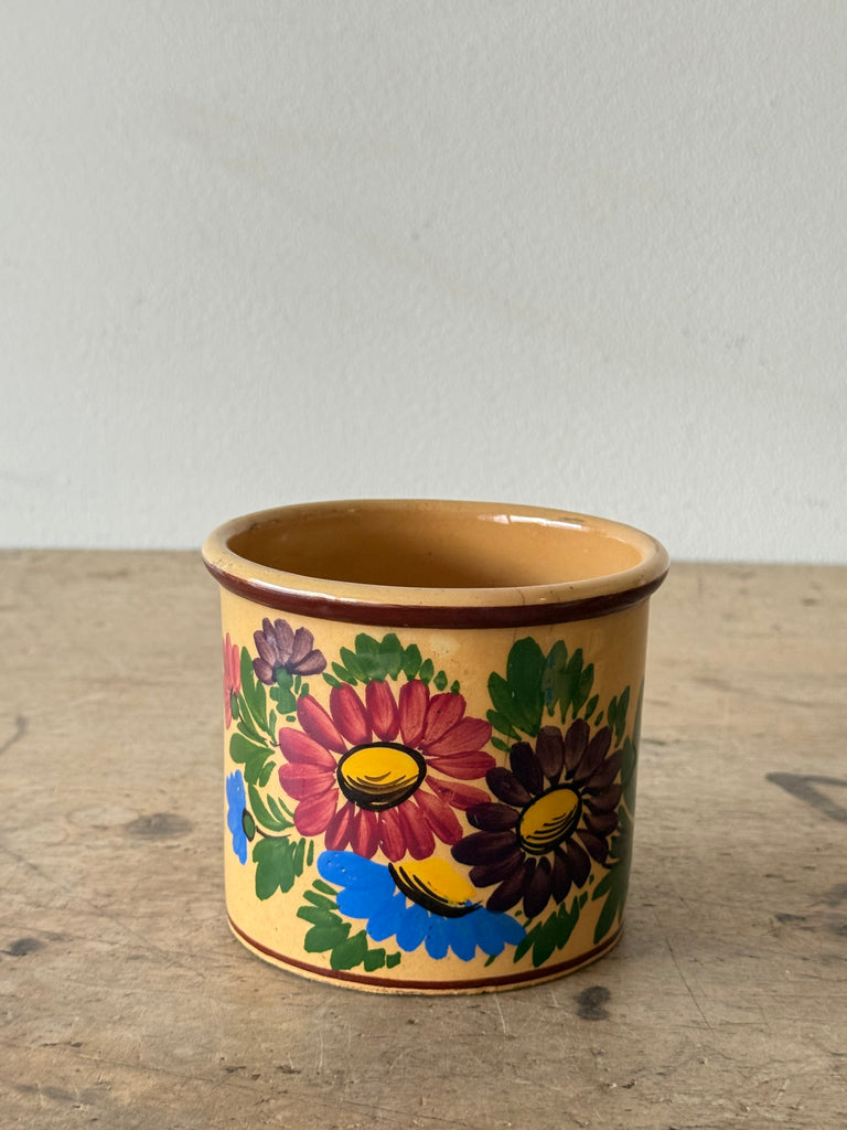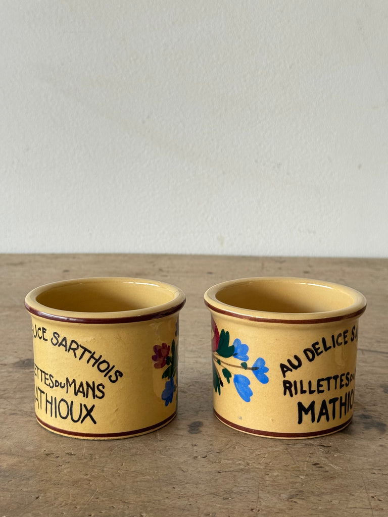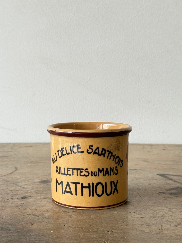 These little jars were once used to hold rillettes in France.  Au device sarthos is of the delight of Sarthos.  Each one has a slightly different design but all are adorable and bring a sense of history to your space.