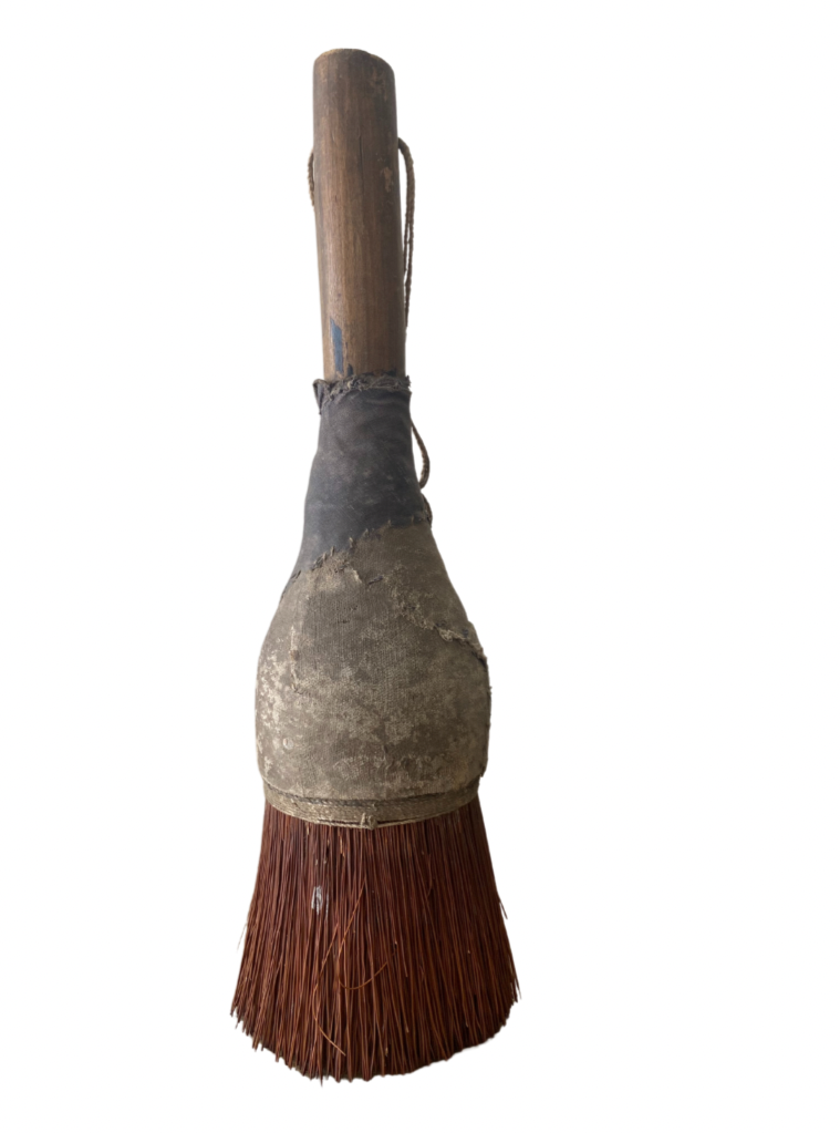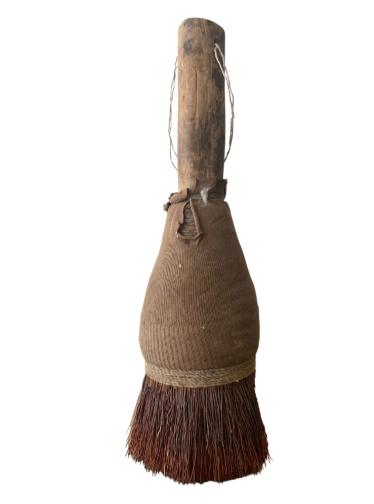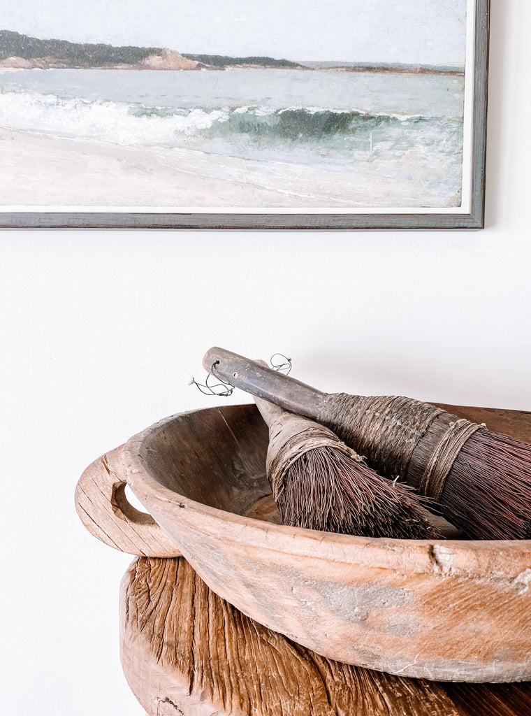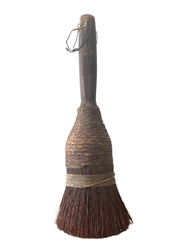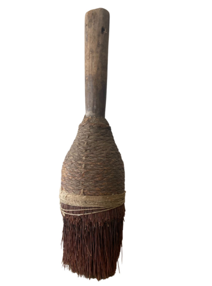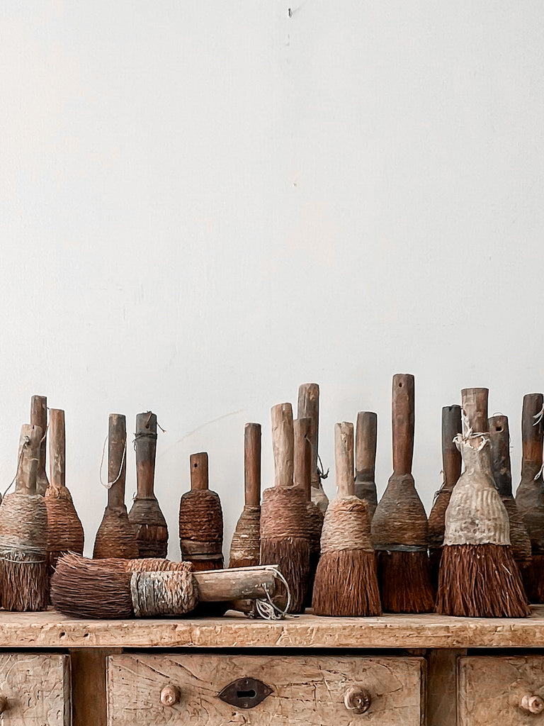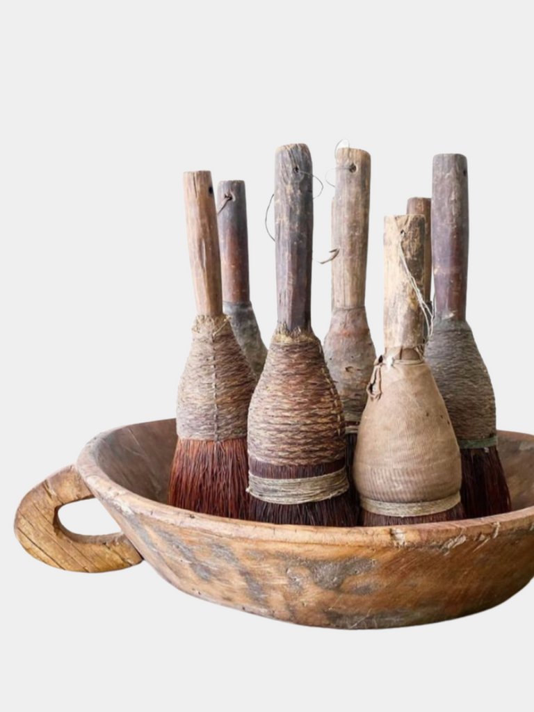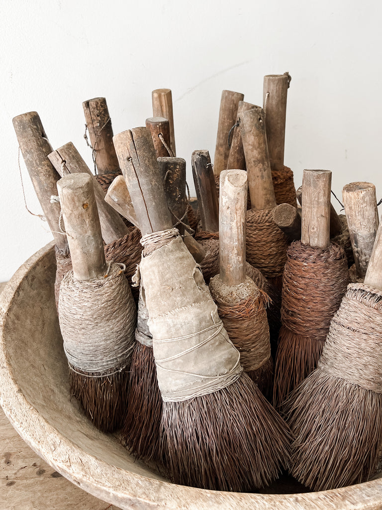 Rarely do we find brushes like these on our travels. Each one of these vintage pieces have  a unique patina and assembly- some are woven with braided natural fibers and others wrapped with old cloth, some lay flat, most also stand up. Perfect styled on their own  and in pairs. Each will vary.