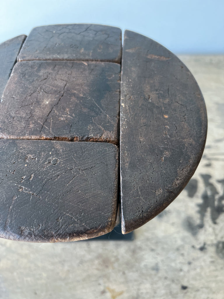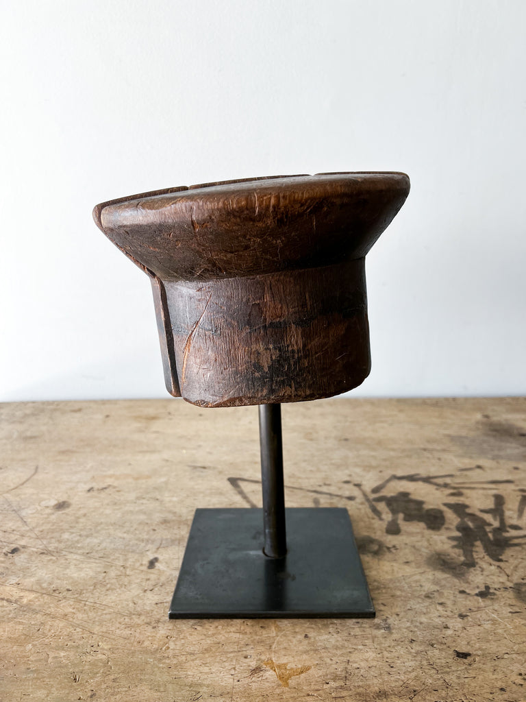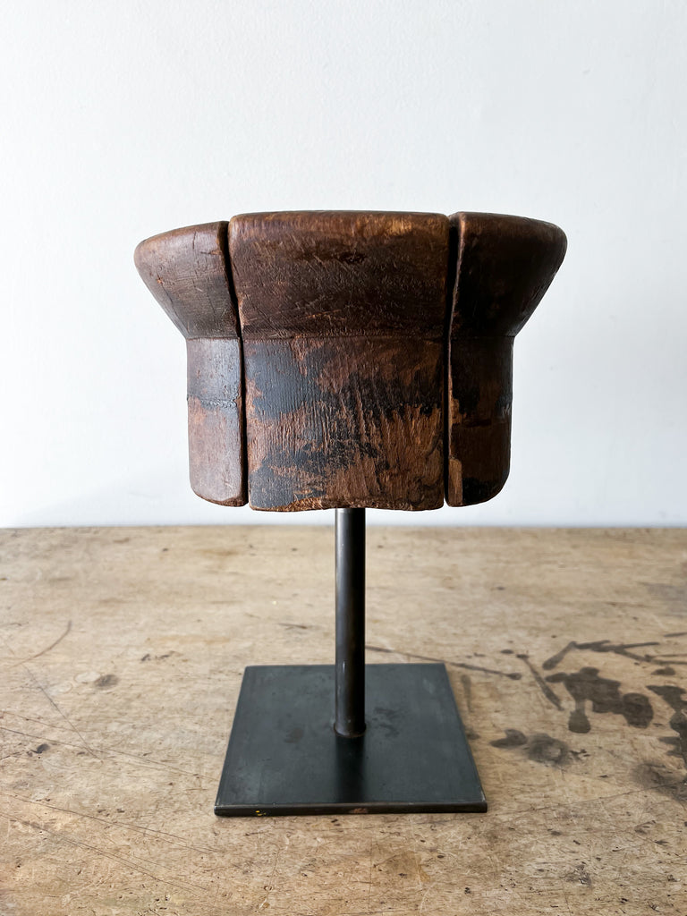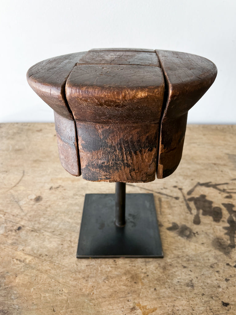 Wooden millinery hat block from early 20th-century France. The button-like structure has been carved from five separate joints of wood, resulting in an interesting, puzzle-like surface. A sculptural decorative accent for any table or shelf-scape. Mounted on a metal stand.