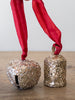Add a little glimmer to your tree with these Metal & Glass Mica Flakes Bell Ornaments w/ Velvet Ribbon. Gold Finish,