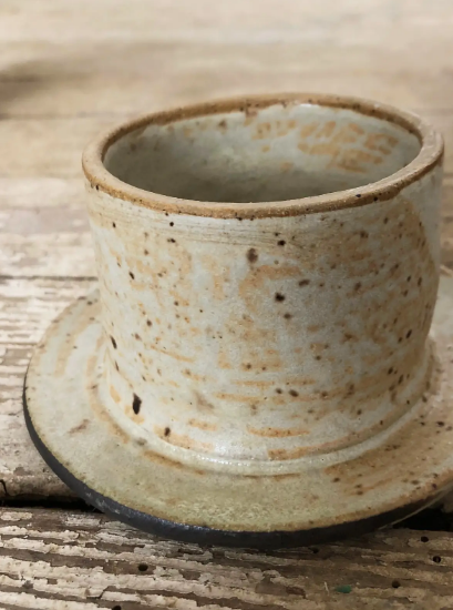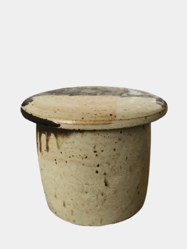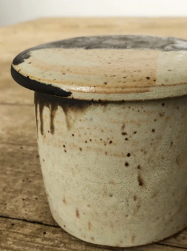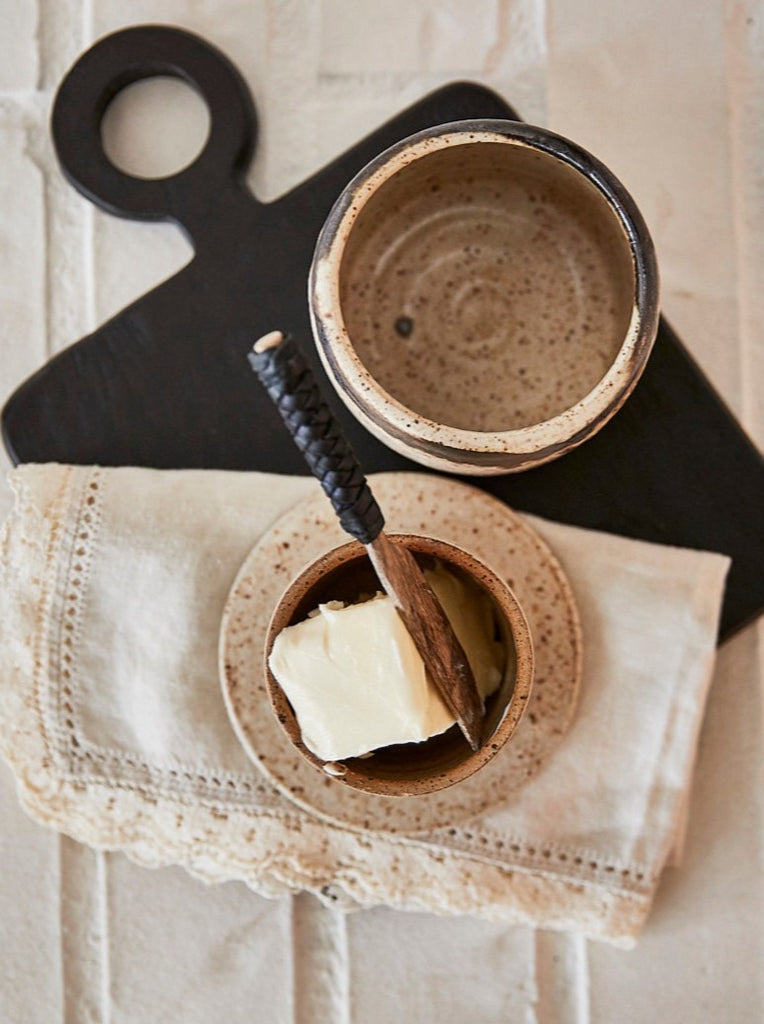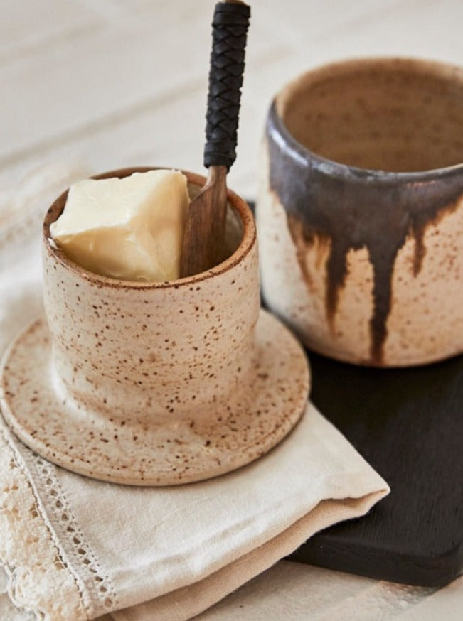 As part of the Desert Collection this crock is crafted from brown stoneware clay with natural dark brown speckles. The glaze is a semi-matte beige with bronze highlights.