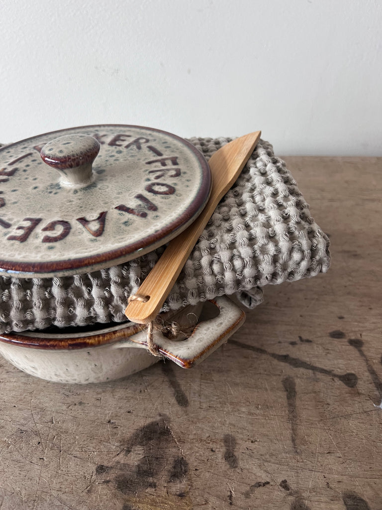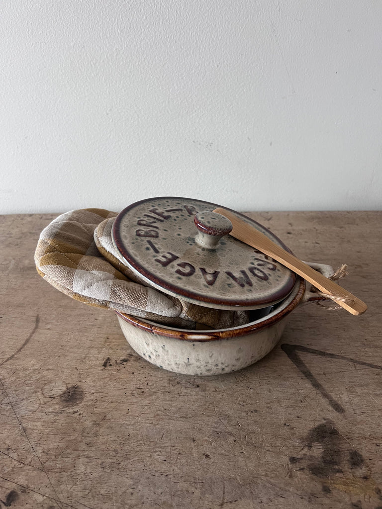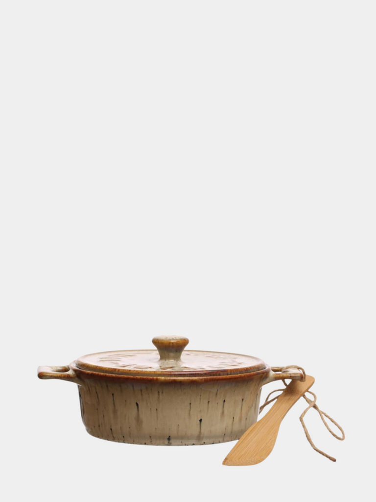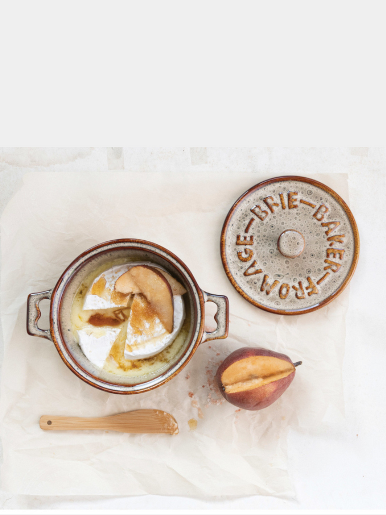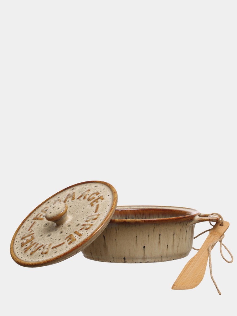 Bake and serve delicious brie cheese with this brie baker with reactive glaze designs in varied brown and tan colors, creating a rustic and cozy look. These bakers come with farmhouse-themed bamboo canapé spreader knives, perfect for slicing and spreading the cheese on crackers or bread. Use them for parties, picnics, or cozy nights at home, or for baking other types of cheese or dips, such as camembert, goat cheese, or spinach artichoke dip. This product is made primarily of Stoneware and Bamboo.