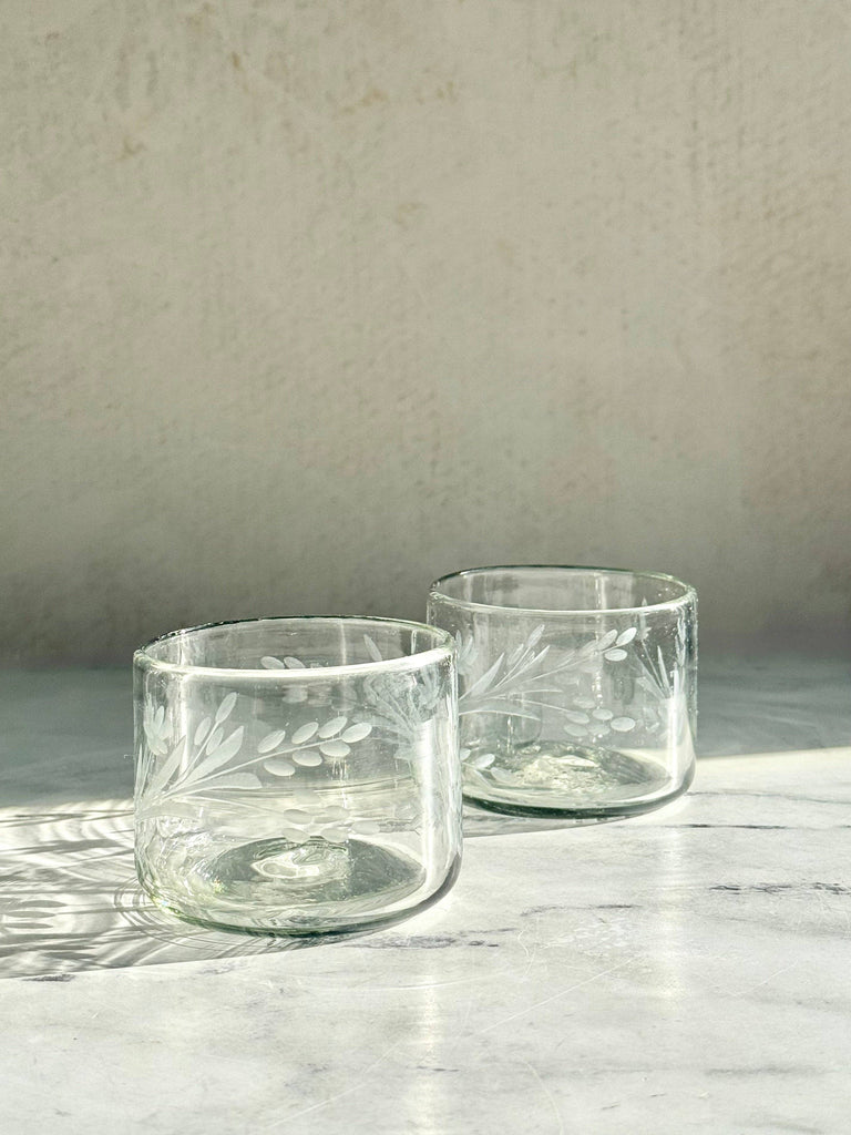 Short, wide and featuring an etched floral design, this lovely vessel will soon become your new favorite for wine, water, appetizers, desserts, and more! KINDLY NOTE: Due to the handmade nature of this item, there will be variations in design and size, as well as slight imperfections, possibly in the form of air bubbles, black specks, pontil and or hand tooling marks, glass or color pattern irregularities; this imperfections are an attribute of handmade craftsmanship and one of the many reasons we love it. Size: Approx. 3.5 Dia x 3.75"H | Capacity: Approx. 9 fl.oz. - Sold individually - 100% Recycled Glass - Food safe - Size & shape will vary (approximately 1/2") from piece to piece. - Dishwasher safe. - Not microwave or oven safe Handmade in Mexico