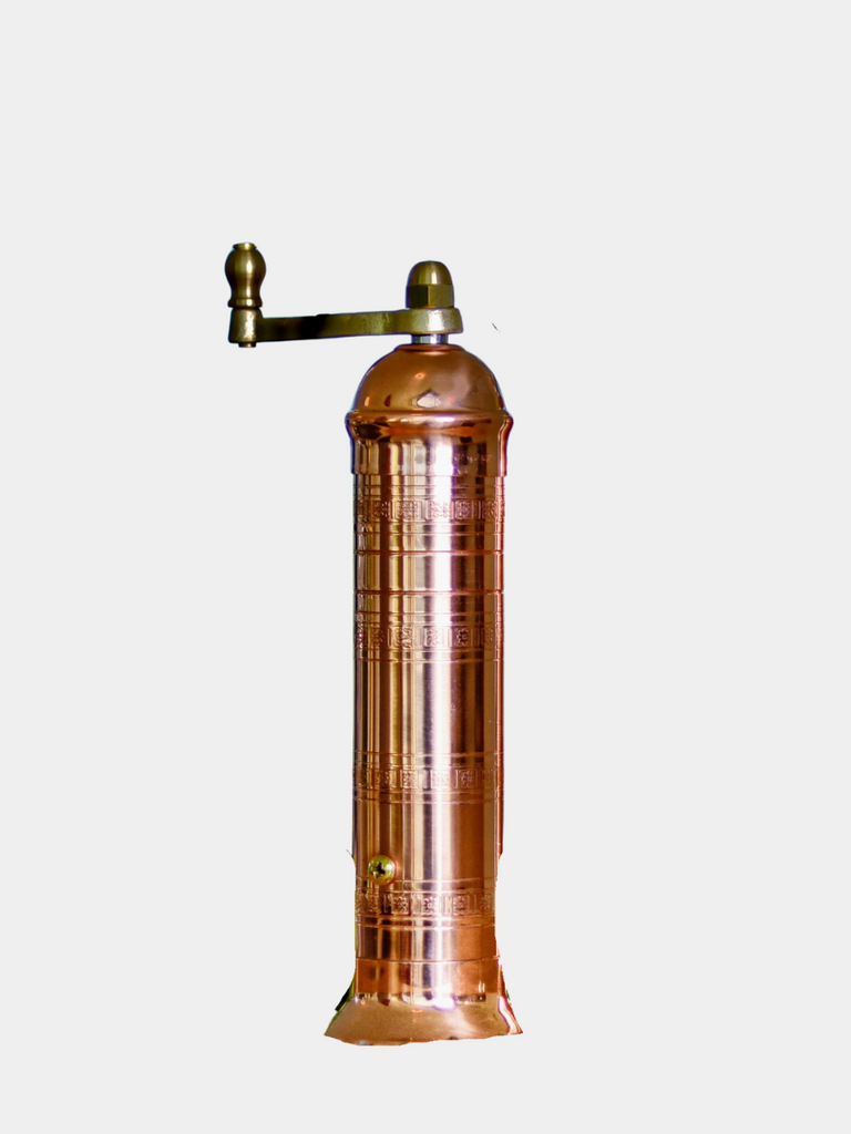 The original 9" 'Copper Mill' from Greek Alexander Handmade Mills are the beautiful, classic pepper  and salt grinders, crafted with precision. The grinder is equipped with a powerfull crank, and able to handle a variety of spices allowing you to infuse your recipes with freshly ground aromas. 'Copper mill' are handmade of solid copper and are equipped with a cast grinder that is designed so that it grinds the spices optimally. The 3-part grinding mechanism first guides the spice down into the mechanism, after which it is coarsely ground and finally completely finely ground. Elevate your cooking experience with this thoughtfully designed spice grinder that effortlessly bring out the vibrant flavors of your dishes. The Alexander Mills are tried and tested products that have been into market since 1977 and are a testament to culinary excellence and convenience. Tags; Spices Ceramic Brass Copper Chrome Crank Original Genuine Mortar Pestle Crushers Pepper Salt Pepper Herbs Coffee Greek Premium