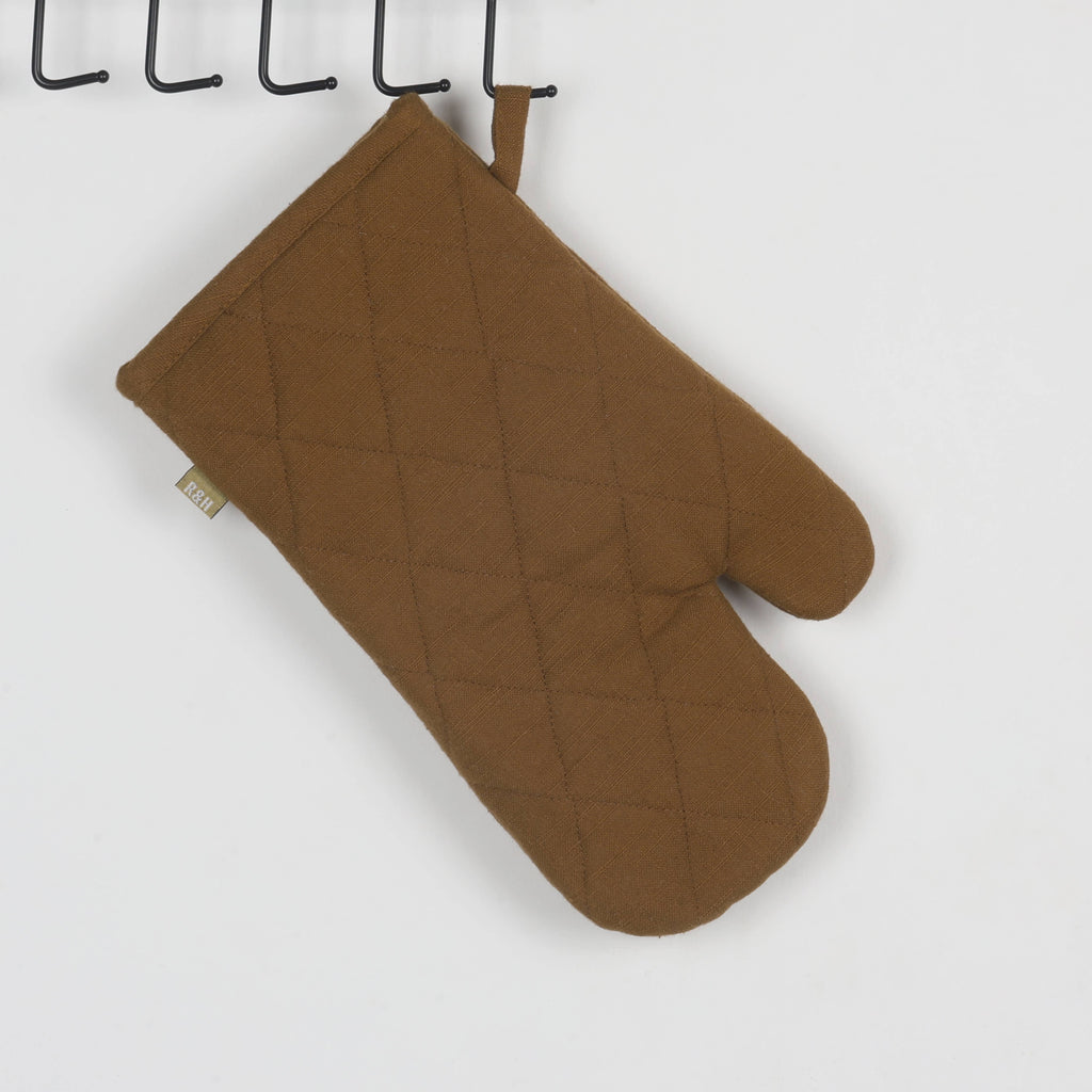 Protect your hands with our versatile oven gloves. The shell is 100% cotton while the wadding is 100% Polyester. Available in earthy tones of olive, rust, and mustard, these durable gloves feature a quilted design for superior heat resistance. A sustainable and stylish choice for any kitchen! Shell - 100% Cotton Wadding - 100% Polyester