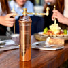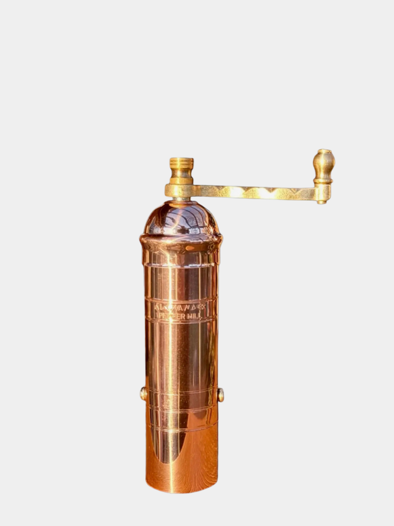 The genuine 1.4 x 7" 'Small Copper Mill' from Greek Alexander Handcrafted Mills is a beautiful, traditional pepper grinder, crafted with precision. The grinder is equipped with a crank, and able to handle a variety of spices allowing you to infuse your recipes with freshly ground aromas. 7" 'Copper Mill' are handmade of solid copper and are equipped with a cast grinder that is designed so that it grinds the spices optimaly. The 3-part grinding mechanism first guides the spice down into the mechanism, after which it is coarsely ground and finally completely finely ground. Elevate your cooking experience with this thoughtfully designed spice grinder that effortlessly bring out the vibrant flavors of your dishes. The Alexander Mills are tried and tested products that have been into market since 1977 and are a testament to culinary excellence and convenience. Tags: Spices Brass Copper Chrome Crank Original Genuine Mortar Pestle Crushers Pepper Salt Pepper Herbs Coffee Handcrafted