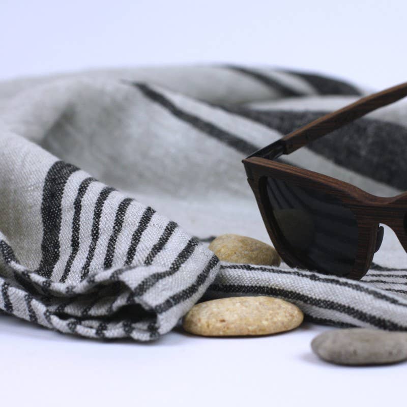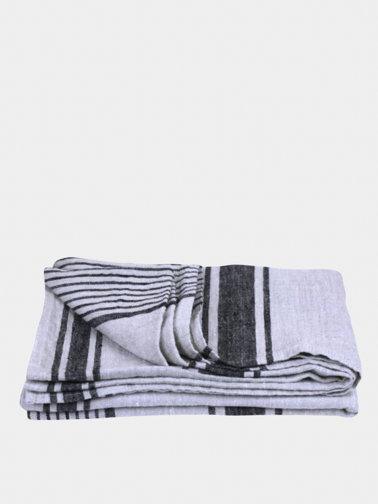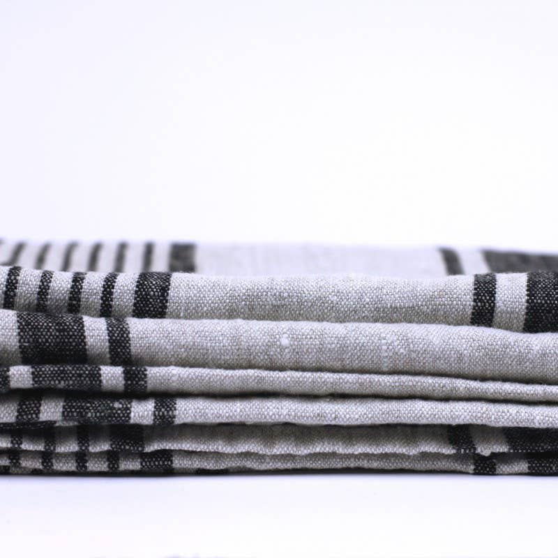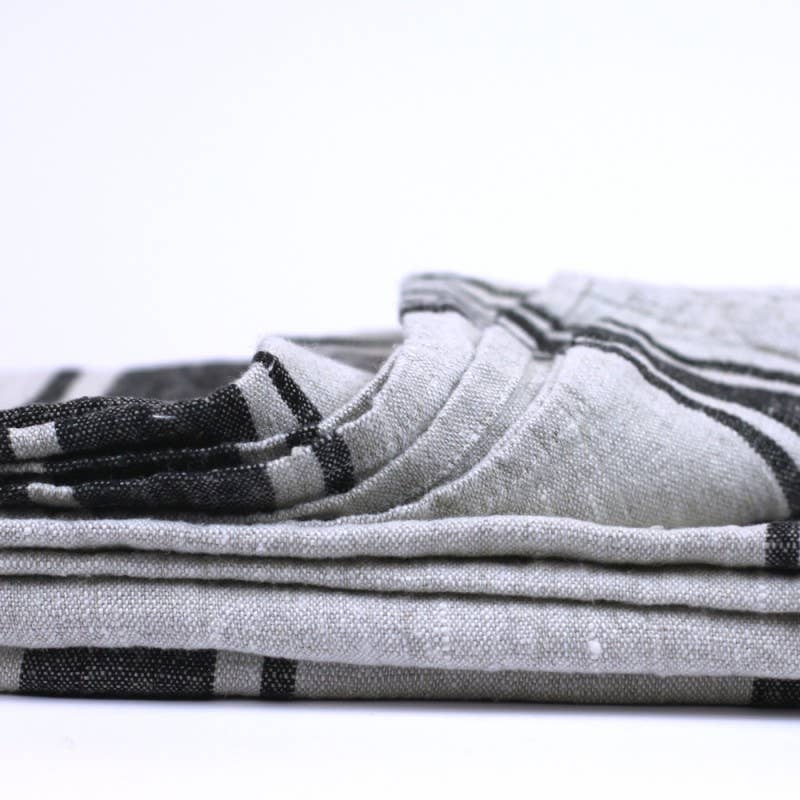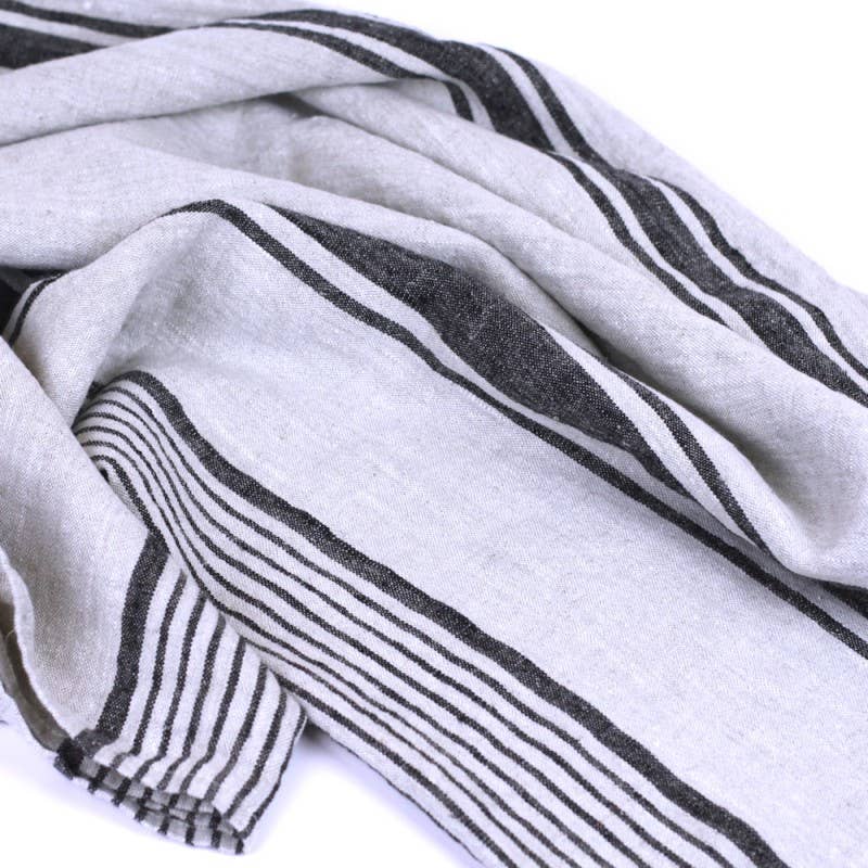 Versatile enough to be a throw or oversized towel. Stonewashed linen, grey with Black Stripes - Luxury Thick Linen - Bath Sheet - Throw - Bath Towel - Deck Towel 100% pure luxury linen - naturally beautiful; stonewashed - pre-washed to make linen soft and textured, will not shrink; no ironing needed; size - 52'' x 71''; hem - 0.4"; loop - attached in the hem to hang the towel; machine washable - yes! - the more you wash it the softer and more absorbent it becomes; water absorption - excellent - linen absorbs more water than cotton, absorbs it faster , dries faster and does not feel as damp; lint free - yes! antibacterial - linen has natural ability to prevent bacterial growth; durability - linen is an investment - will serve you a lifetime; space saver - takes much less space than a terry towel but works so much better! Produced in Europe from locally grown flax. Made from Oeko-Tex® Standard 100 certified (product class II) linen fabric.