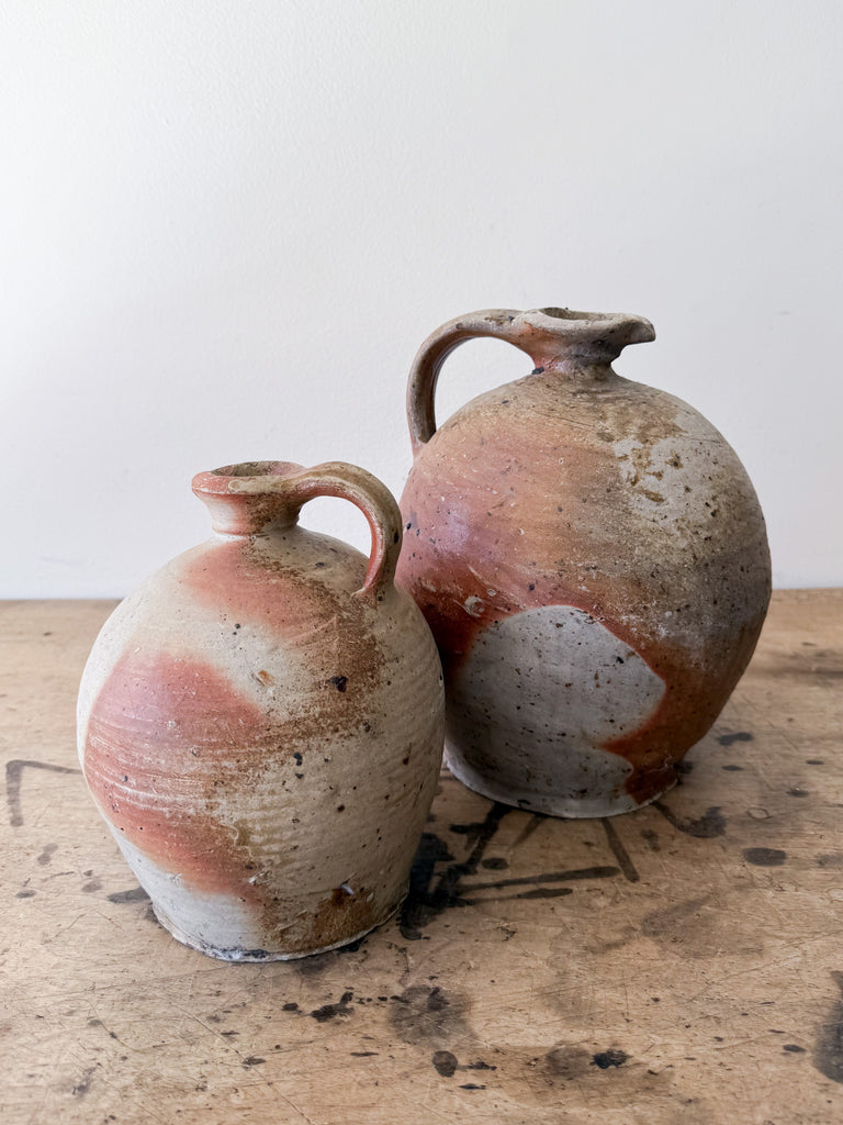 A rare find!  This Oversized Vintage French Stoneware jug  from the Brittany region of France is hand-made on a potter's wheel, these jugs were used on the farms in this region of France to hold either apple cider or milk.  Group a few together or simply choose your favorite….Simply Stunning.