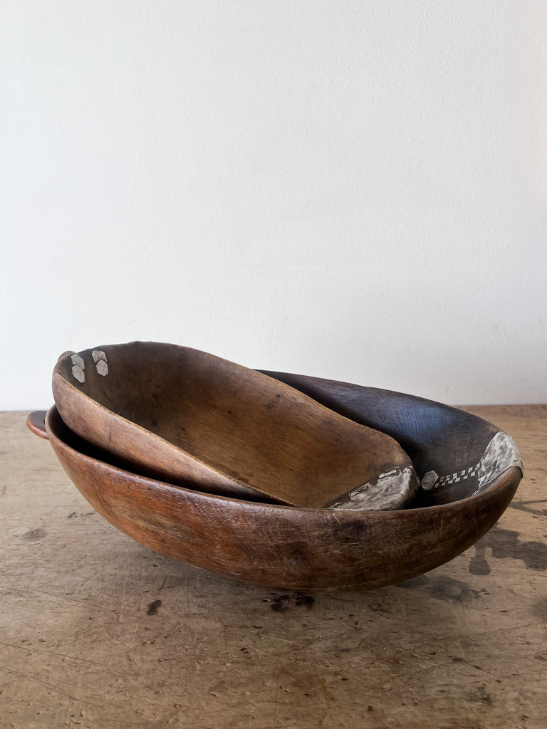 From the Burundi Tribe these woods scoops are hand carved and in some cases repaired with intricate aluminum details.  Each has a dark patina and show signs of age and use.